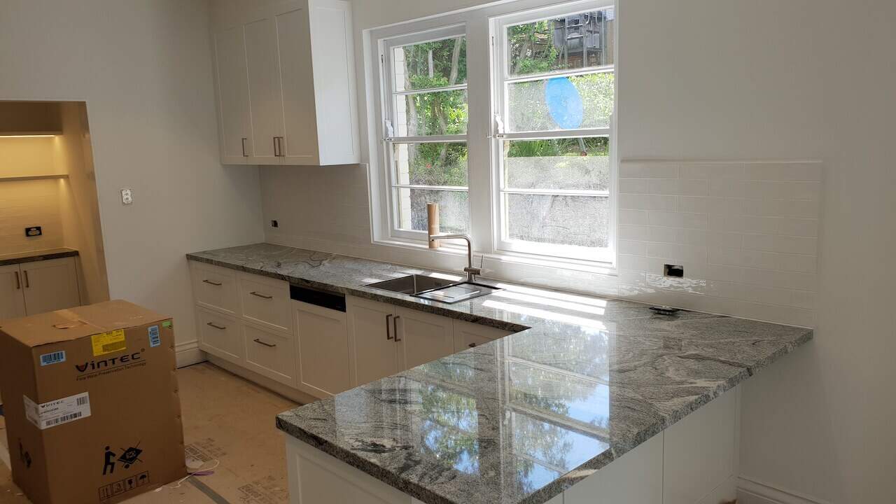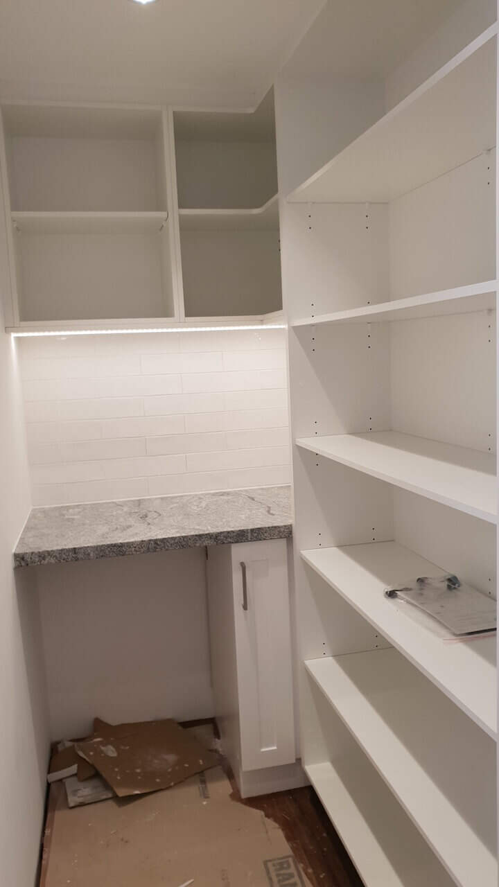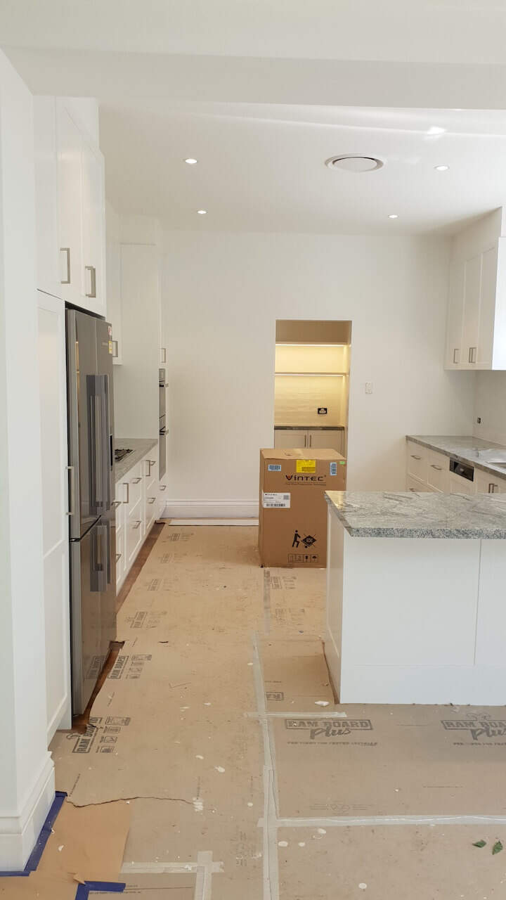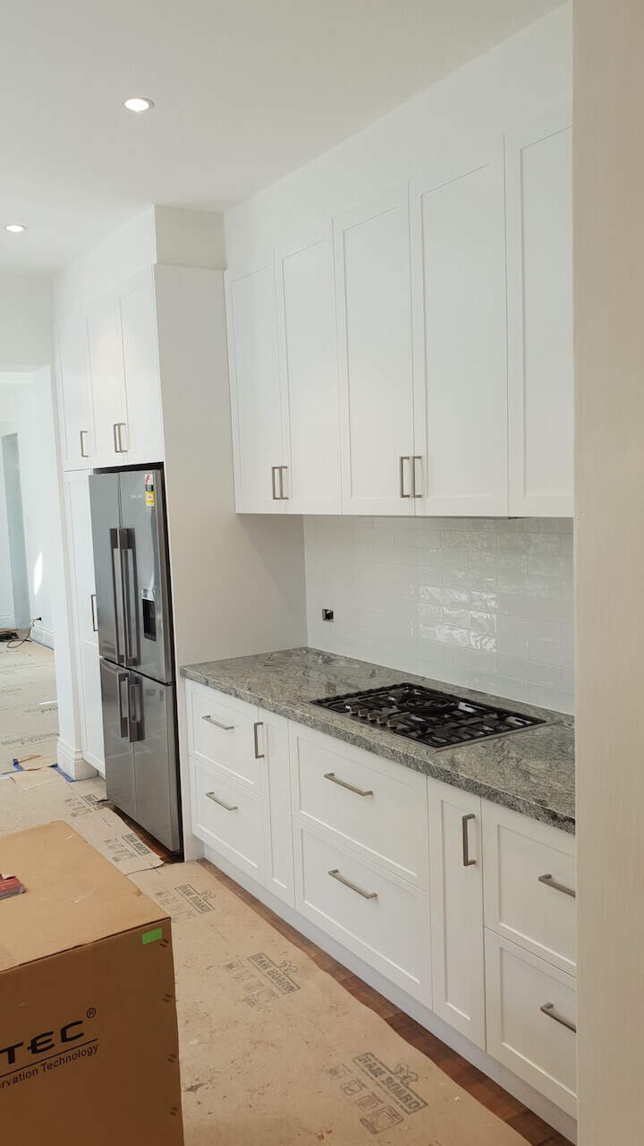 Lovely white shaker doors, glossy subway tiles, and a unique tone granite benchtop + earthy colour floors are always winners when creating your joinery design. The designer carefully planned these joinery rooms to be practical and functional per clients’ needs. This home is on TV shows and magazines as it is heritage listed and has a great historical story. (Final site clean yet to be done and Ramboard still to be removed).