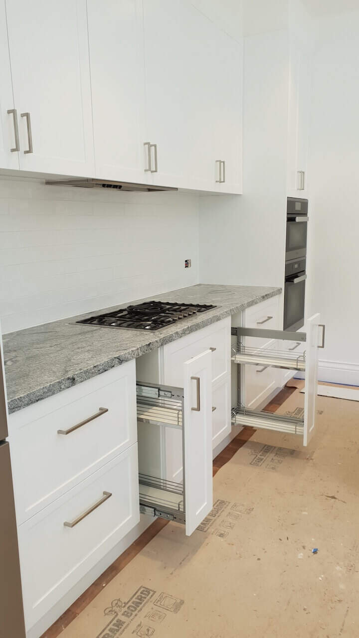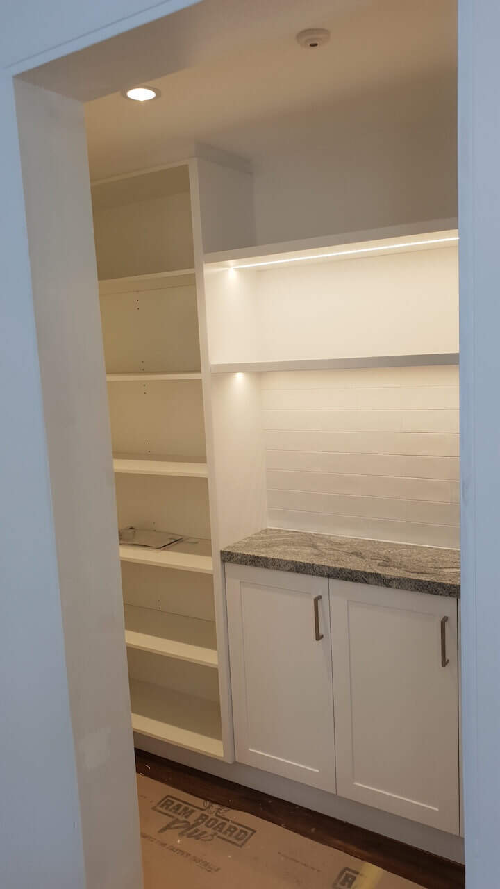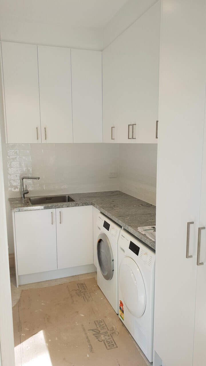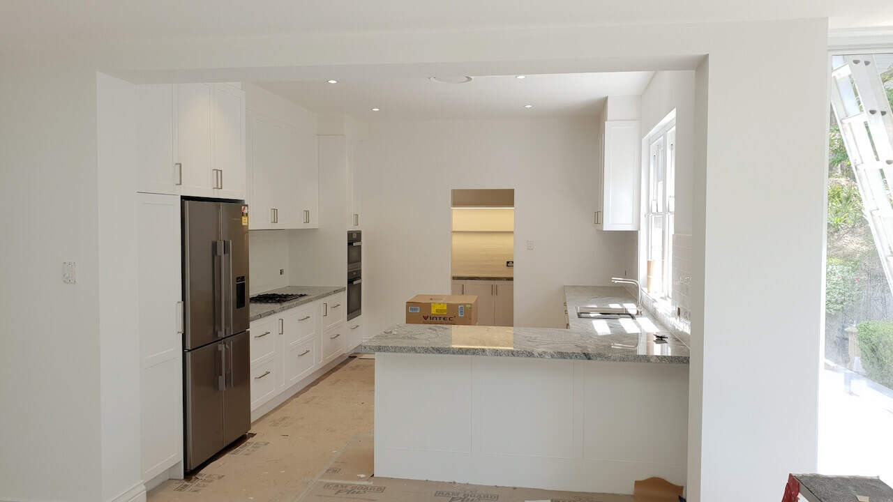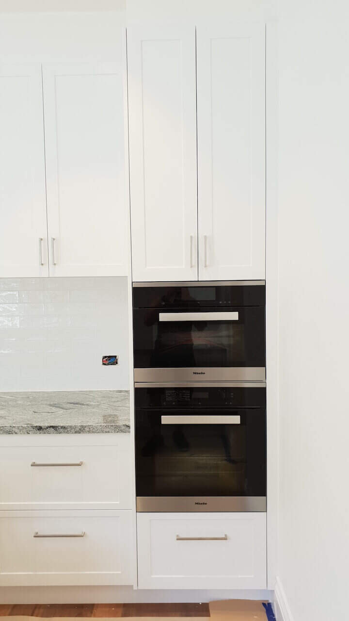 Lovely white shaker doors, glossy subway tiles, and a unique tone granite benchtop + earthy colour floors are always winners when creating your joinery design. The designer carefully planned these joinery rooms to be practical and functional per clients’ needs. This home is on TV shows and magazines as it is heritage listed and has a great historical story. (Final site clean yet to be done and Ramboard still to be removed).